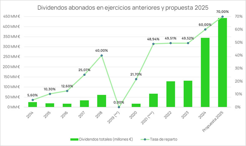 Per a l'exercici finalitzat el 31 de desembre de 2025, el Consell d'Administració té intenció de proposar a la Junta General Ordinària d'Accionistes de 2026, la distribució d'un dividend per un valor total de 443 milions d'euros, dels quals 169 milions d'euros, equivalent a 0,0657 € per acció ordinària, van ser abonats el 25 de setembre de 2025 com a dividend a compte. L'import restant, ascendent a 274 milions d'euros, se satisfarà com a dividend complementari de l'exercici 2025, a raó de 0,10656 € bruts per cada acció amb dret a participar en el repartiment en el moment del seu abonament (sense considerar el saldo d'autocartera en la data de pagament). La taxa de repartiment de dividends serà del 70,00%(*).