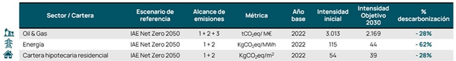 Aquests objectius impliquen una reducció de la intensitat d'emissions del 28 % i el 62 % per als sectors de combustibles fòssils i energia, respectivament, i del 28 % per a la cartera hipotecària residencial.