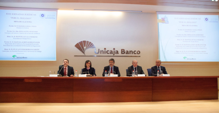 Unicaja Banco patrocina y acoge un año más las Jornadas Jurídicas “Por el diálogo” que, organizadas en su XVII edición por la Asociación Profesional de la Magistratura (APM) y la Cátedra de Derecho Procesal de la Universidad de Málaga (UMA), se inauguran el próximo miércoles y se celebran lo largo de esta semana en Málaga. Las ponencias tendrán lugar los días 18, 19 y 20 de abril, en el Salón de Actos de Unicaja Banco de la Avenida de Andalucía, a partir de las 18,30 horas. La asistencia a las mismas es gratuita hasta completar aforo.