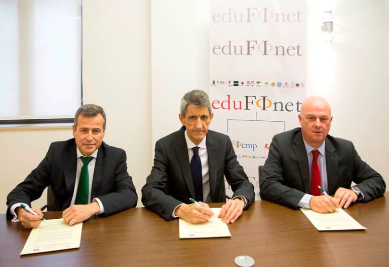 El convenio ha sido suscrito por el Presidente de la Fundación Caja Duero, José María de la Vega; el Director General de la Fundación Bancaria Unicaja, Sergio Corral; y el Director del Proyecto Edufinet y Director General de Secretaría General y Técnica de Unicaja Banco, José M. Domínguez.