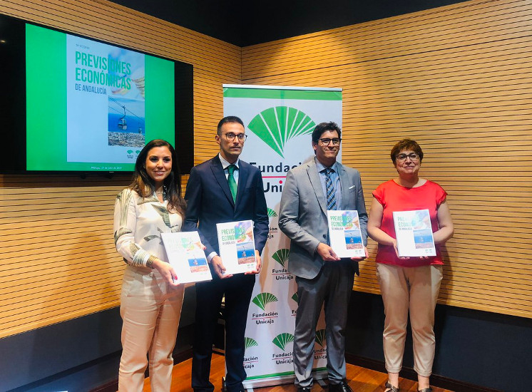 El número 97 del informe trimestral ‘Previsiones Económicas de Andalucía’, correspondiente a Verano 2019, que ha sido realizado, como en ediciones anteriores, por Analistas Económicos de Andalucía (sociedad de estudios del Grupo Unicaja Banco) y patrocinado por la Fundación, ha sido presentado hoy en la Sala Unicaja de Conciertos María Cristina de Málaga, con la asistencia del Consejero Delegado de Analistas Económicos de Andalucía, Rafael López del Paso; el Director de Actividades Socioculturales de la Fundación Unicaja, Rafael Muñoz; la Coordinadora del Informe de Analistas Económicos de Andalucía, Felisa Becerra, y la Directora de Comunicación, Publicidad y Relaciones Externas de la Fundación Unicaja, Cristina Rico.