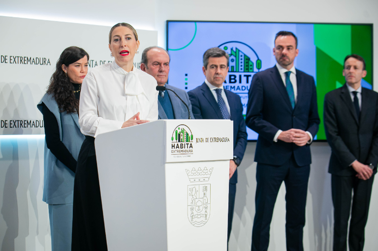 La presidenta de la Junta de Extremadura, María Guardiola, ha presentado junto a los representantes de once entidades bancarias, entre ellas Unicaja, el programa 'Habita Extremadura', con el que se impulsará la promoción de la construcción de al menos 3.036 viviendas protección oficial hasta 2027.