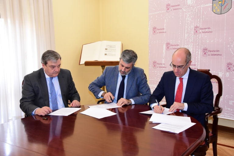 The president of Salamanca County Council (Diputación de Salamanca), Javier Iglesias, has signed, together with the Unicaja Banco representatives Pedro López Fraile, Head of Business at Corporate Banking, and Salvador Jorge de Alba, Corporate Banking Account Manager, the agreement to make a €30 million advance facility available to town halls on the collection of taxes during 2020.