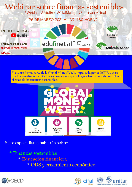 The Edufinet Project, promoted by Unicaja Banco and Fundación Unicaja, and the Malaga International Training Center for Authorities and Leaders (CIFAL) are jointly organizing this Friday 26 March, at 11:30, a webinar on the importance of sustainable finance. This activity falls within the framework of the Global Money Week, a global event for young people to learn about financial sustainability and to make sound financial decisions.