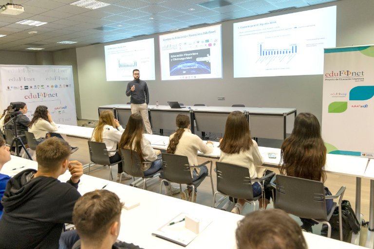 This specific day on cybersecurity, which was attended in person by almost fifty students from IES Mediterráneo (Málaga), was also broadcast via streaming, through Edufinet's social media profiles and its website (www.edufinet.com). In this way, several schools that regularly collaborate with the financial education project, as well as the general public, were also able to join in.