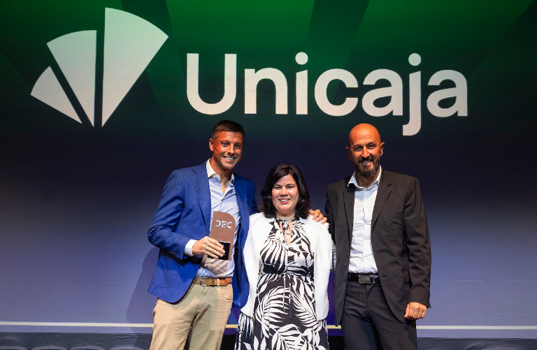 During the DEC Awards gala, which took place last Wednesday in Madrid, Unicaja's Head of Change Management, Daniel Gálvez, the Head of Fraud Control, Dinella Aguilera, and the Head of Artificial Intelligence, Javier Porras, collected the award on behalf of Unicaja.