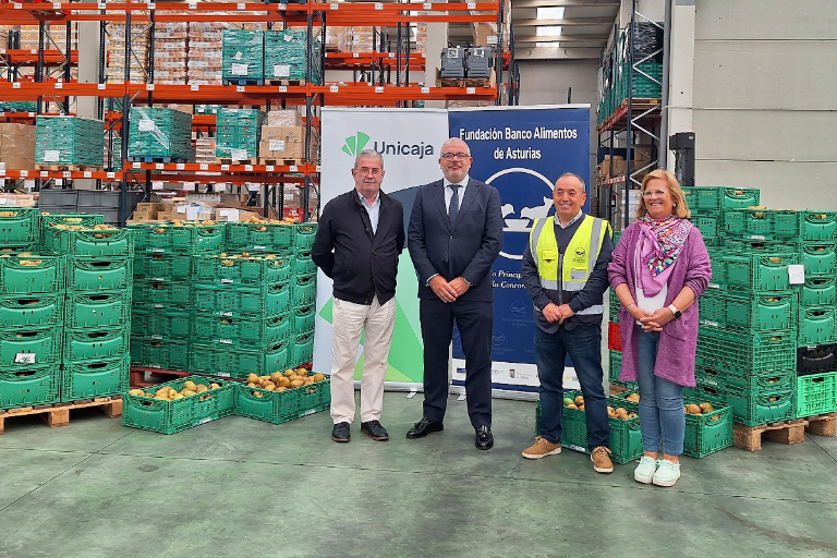 The first part of this delivery, of 1,500 kilos of fruit, was made at the organization's headquarters in Asturias, with the presence of Luis Manuel Taboada, Regional Manager - North of Unicaja, and Bernardo Sopeña, Josefa Cañadas and Juan José Cima, president, vice-president and secretary of the Asturias Food Bank Foundation.