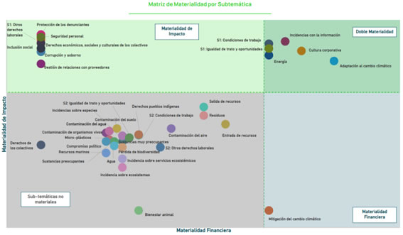 La construcción de la matriz de materialidad se lleva a cabo tras finalizar la evaluación de las incidencias, riesgos y oportunidades detectados. A continuación, se presenta gráficamente la mencionada matriz que ilustra los resultados del análisis efectuado en términos de materialidad financiera, de impacto y de doble materialidad: