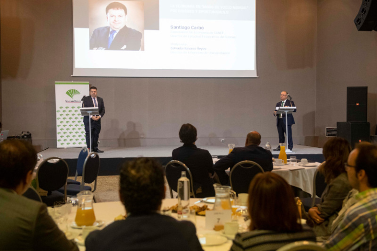 Unicaja Banco ha celebrado esta mañana en Granada la sexta jornada de Enclave Empresarial que ha contado con la participación de Santiago Carbó, reconocido Catedrático de Economía y Director de Estudios Financieros de Funcas, quien ha analizado, junto a más de un centenar de personas, la previsión de la evolución de los costes de financiación y los sectores que arrastrarán el crecimiento y la inversión en los próximos años.