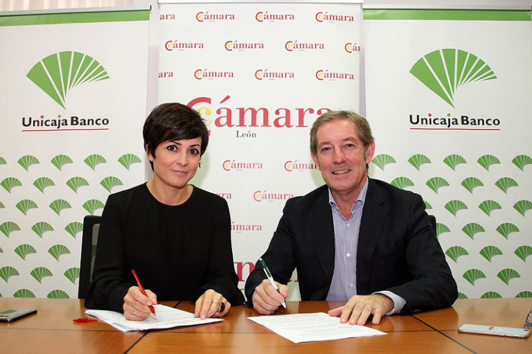 El convenio permitirá a la Cámara seguir trabajando, con la colaboración de Unicaja Banco, en la estrategia de exportación de las pymes leonesas, a través de la información y asesoramiento para la internacionalización, la organización de la quinta edición de los Premios a la Exportación.