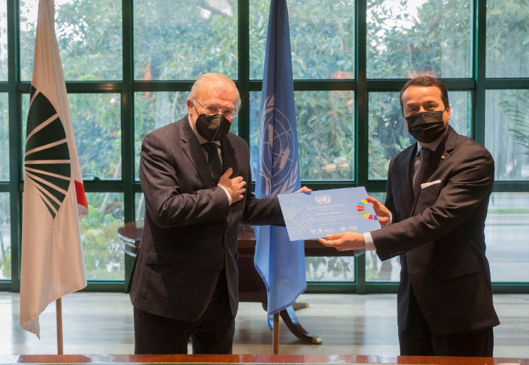 Precisamente, esta placa, firmada en Ginebra (Suiza), en nombre del Subsecretario General de las Naciones Unidas y Director Ejecutivo de Unitar, Nikhil Seth, ha sido entregada recientemente al Presidente de Unicaja Banco, Manuel Azuaga.por el Director de la División para la Inclusión Social de Unitar, Alex Mejía.