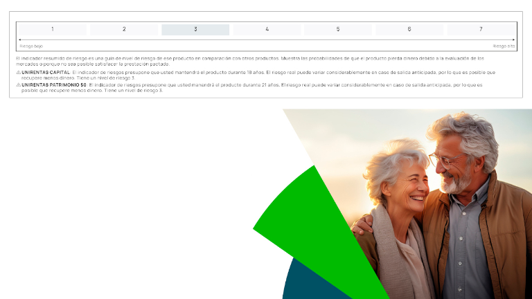 - Unirentas Patrimonio 50 asegura un capital decreciente en un 5% anual durante los primeros diez años, hasta alcanzar el 50% de la prima única invertida, momento en el que el capital garantizado se mantiene fijo.